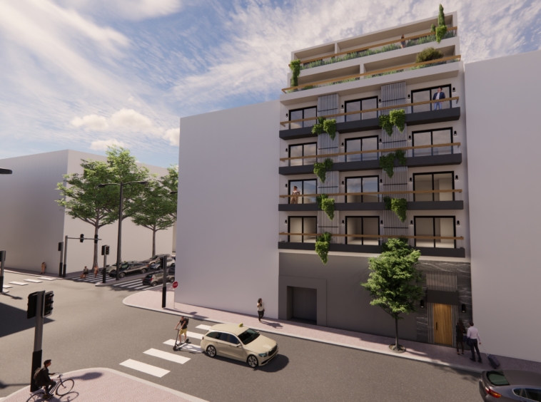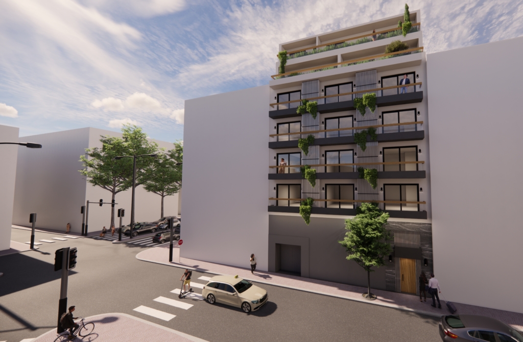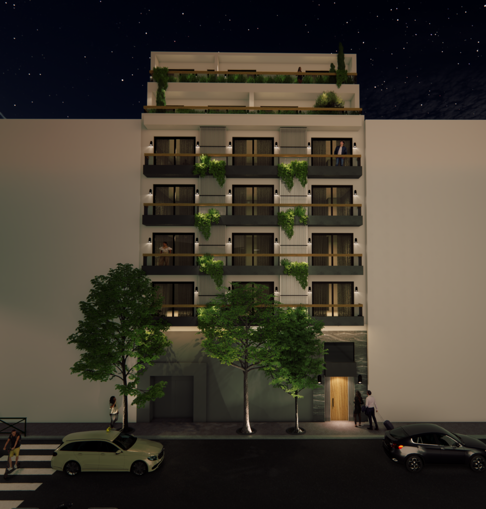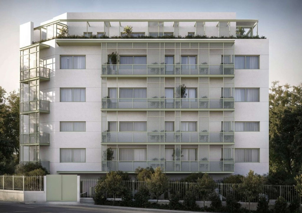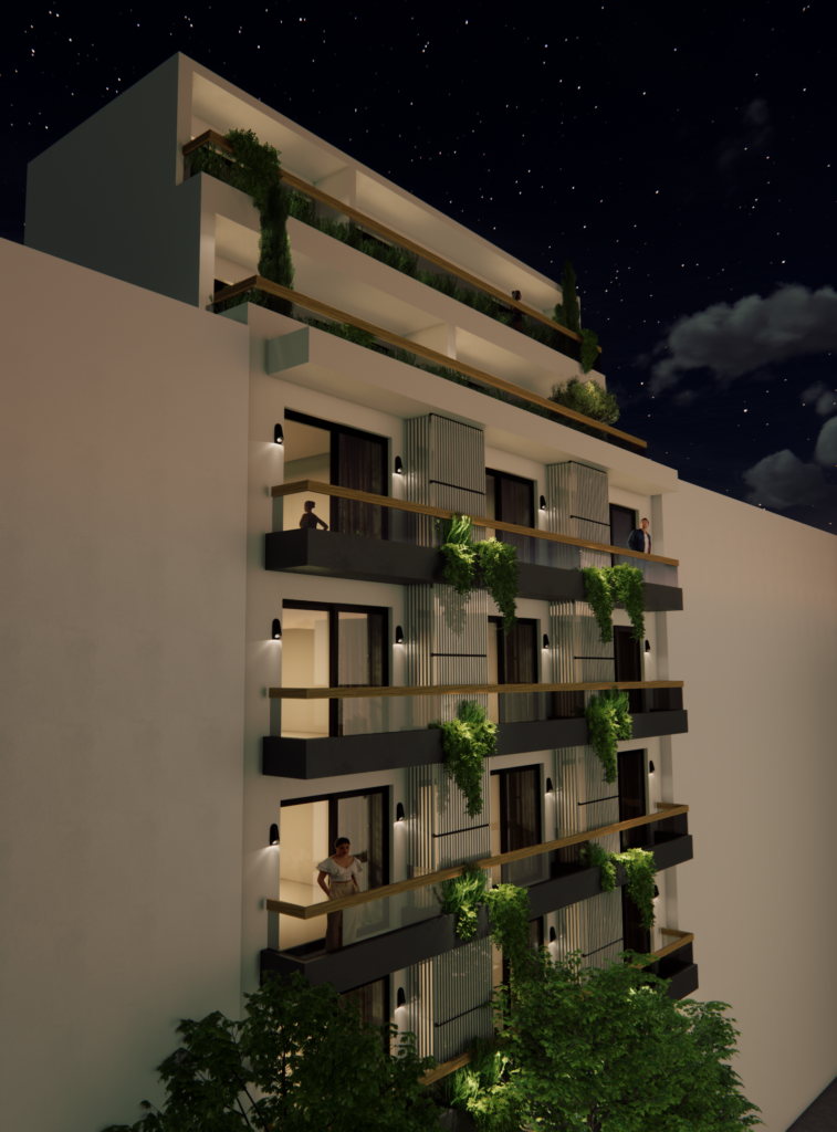 Floors 1-4 are built and are all of them identical, 57sq.m. with 1 bedroom 1 bathroom open space kitchen and living room. The properties will be A+ energy classification, including Thermoinsulation and Solar Panels on the roof, including A/C split units, kitchen appliances.